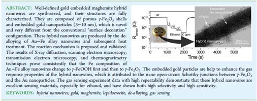 人妻NTR 陈庆老师指导的李娜梅等同学利用电化学沉积技术与模板技术相结合制备出多层的Au-Fe双金属的纳米线,再通过氧化和真空加热处理得到Au-γ-Fe2O3复合纳米线(ACS Appl. Mater. Interfaces 2015, 7, 10534?10540; DOI: 10.1021/acsami.5b02087)。借助于XRD, SEM和 TG 等技术探索了合成机理,Au-Fe复合纳米线先转化成Au-γ-FeOOH,再转化成Au-γ-Fe2O3。该结构新颖独特,不同于以往的贵金属表面掺杂,Au被包裹在内部,表现为3-10nm的颗粒,纳米线的外侧为多孔的γ-Fe2O3薄膜。材料合成后,小组还做了气体传感性能测试。结果表明Au掺杂在半导体内大大提高了单纯铁氧化物对还原性气体的响应,这归功于在Au与γ-Fe2O3形成了开路肖特基结。该纳米线对乙醇响应尤其灵敏,选择性好,是检测乙醇的理想材料。