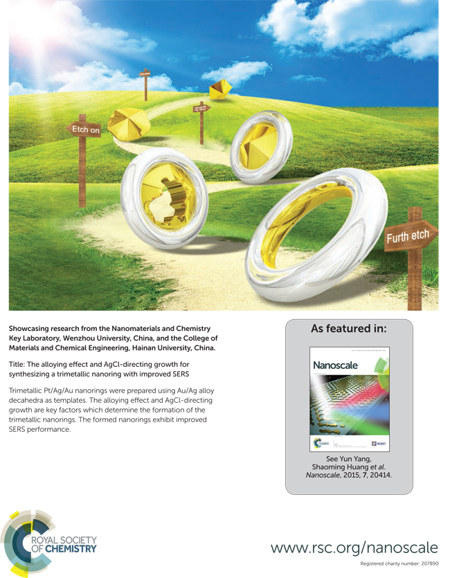 以Au十面体和八面体纳米颗粒为模板,通过选择性刻蚀反应制备了Pt纳米环(ACS Nano,2012,6, 4072-4082)。并进一步改进该方法,将纳米环的产率大大提高(Nanoscale, 2015,7,20414-20425, Back cover)。此外,通过类似的过程合成了其它的纳米框(RSC Advances, 2015, 5, 103797-103802)。