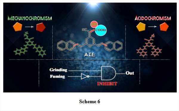 该课题组周一斌等同学设计合成了一系列以丙二腈、氰基乙酸乙酯为电子受体,以蒽为电子给体的D-π-A型4H-吡喃类荧光分子 (Scheme 6,Dyes Pigm. 2017, 141, 428),发现这些化合物的酸致变色性质只与电子受体的结构类型相关,而其压致变色性质则同时受到电子给体蒽单元的连接位置和电子受体结构的影响。并且由于这些4H-吡喃类荧光分子的固态荧光变色性质可以通过不同的外在刺激进行调控,以不同的外在刺激为输入项、不同的荧光颜色为输出项可以构建不同的分子逻辑门。