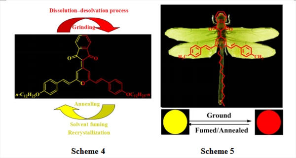 该课题组刘艳则等同学则设计合成了一系列基于茚-1,3-二酮亚甲基-4H-吡喃和连有不同长度烷氧基苯的D-π-A型聚集诱导发光分子 (Scheme 4,J. Mater. Chem. C 2016, 4, 2862),发现这类化合物在固态的压致变色效应具有明显的链长依赖性,即烷氧基链长度的增加有利于增强其固态样品在外在压力刺激下荧光变色的对比度。刘艳则等同学进一步发现基于带有不同烷基长链的茚-1,3-二酮亚甲基-1,4-二氢吡啶和4-甲基苯构建的D-π-A型聚集诱导发光分子(Scheme 5,J. Mater. Chem. C 2016, 4, 5970)也呈现出具有烷基链长依赖性的压致变色性质,并且相较于4H-吡喃衍生物, 1,4-二氢吡啶类衍生物表现出具有更高对比度的压致变色效应,表明以N-烷基取代4H-吡喃骨架中的氧原子增强分子构象的扭曲程度有利于获得具有高对比度的固态刺激响应型荧光材料。