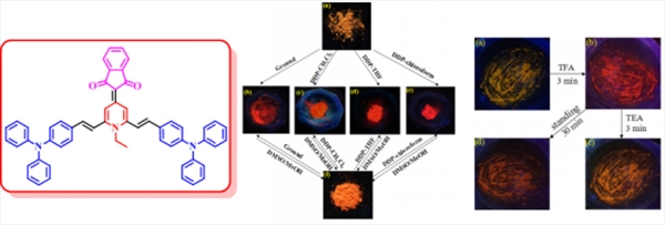 该课题组雷云祥等同学设计合成了以N-乙基-1,4-二氢吡啶为基本结构单元,以茚-1,3-二酮为受体单元、三苯胺为给体单元的D-π-A型聚集诱导发光分子 (Scheme 2, J. Phys. Chem. C 2015, 119, 23138),发现这种具有高度扭曲构象的荧光分子在固态表现出有趣的多重荧光刺激响应性质,即压致变色、有机溶剂诱导的固态荧光变色和酸致变色性质。雷云祥等同学进一步设计合成了以二甲基氨基苯基为供电子基团,分别以丙二腈、氰基乙酸乙酯或茚-1,3-二酮为吸电子基团的D-π-A型具有聚集诱导发光性质的1,4-二氢吡啶类衍生物 (Scheme 3,Dyes Pigm. 2016, 133, 261-272),发现这些具有不同吸电子单元的化合物在固态时表现出不同的荧光刺激响应行为,并发现这些化合物的纳米颗粒在低浓度时,可以作为具有很高生物相容性的荧光成像试剂应用于活体细胞的成像。