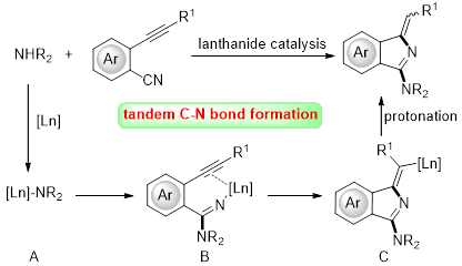 标题(中文):稀土金属催化仲胺与2-炔基苯甲腈串联加成/环化反应构建氨基异吲哚衍生物