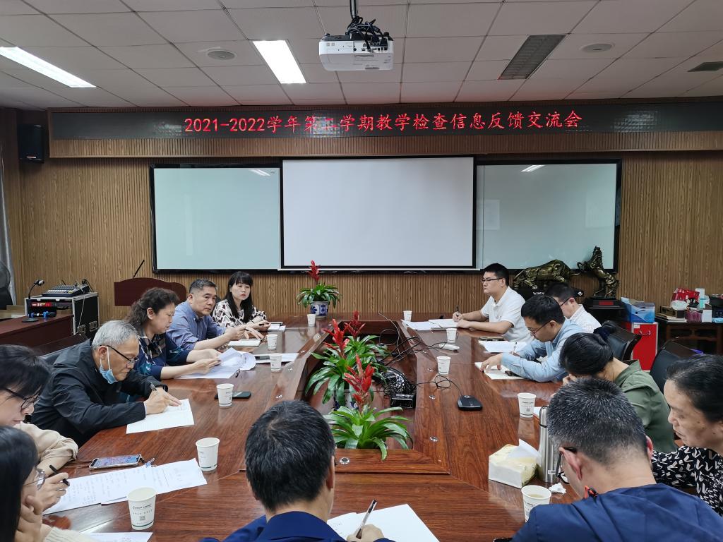 在11B204会议室召开2021-2022学年第二学期教学检查信息反馈交流会。校督导蔡桂平、陈文和应向东,教师教学发展中心科长林丽雪、化材学院教学副院长陈锡安、学院各专业负责人、各基础教学团队负责人、学院督导组及教学科全体成员参加会议。