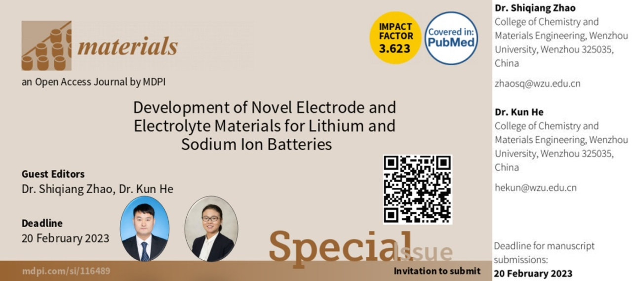 化材学院赵世强和何坤博士受邀担任国际期刊《Materials》(《材料》)的电池专刊“Development of Novel Electrode and Electrolyte Materials for Lithium and Sodium Ion Batteries”(锂/钠离子电池新型电极和电解质开发)的Guest Editor(客座主编)。