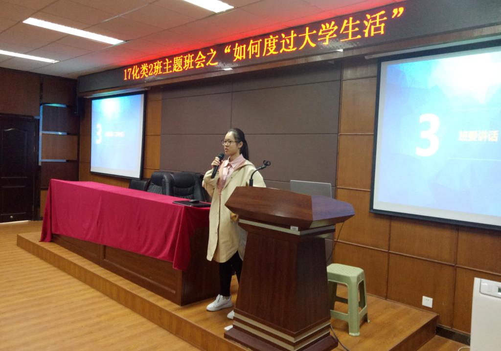 开学至今已经有一个多月,有些同学还没能从高中的学习生活向大学的学习生活转变。经过班委们交流讨论之后,17化类2班于10月30日早上在化材楼11B-208室召开“如何度过大学生活”主题班会。