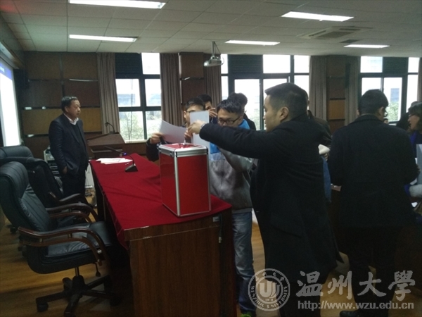 党委组织部吴冬冬老师现场发放测评表。到场的师生根据干部工作实绩、个人总结、述职述廉述德述法等情况对其作出评价。