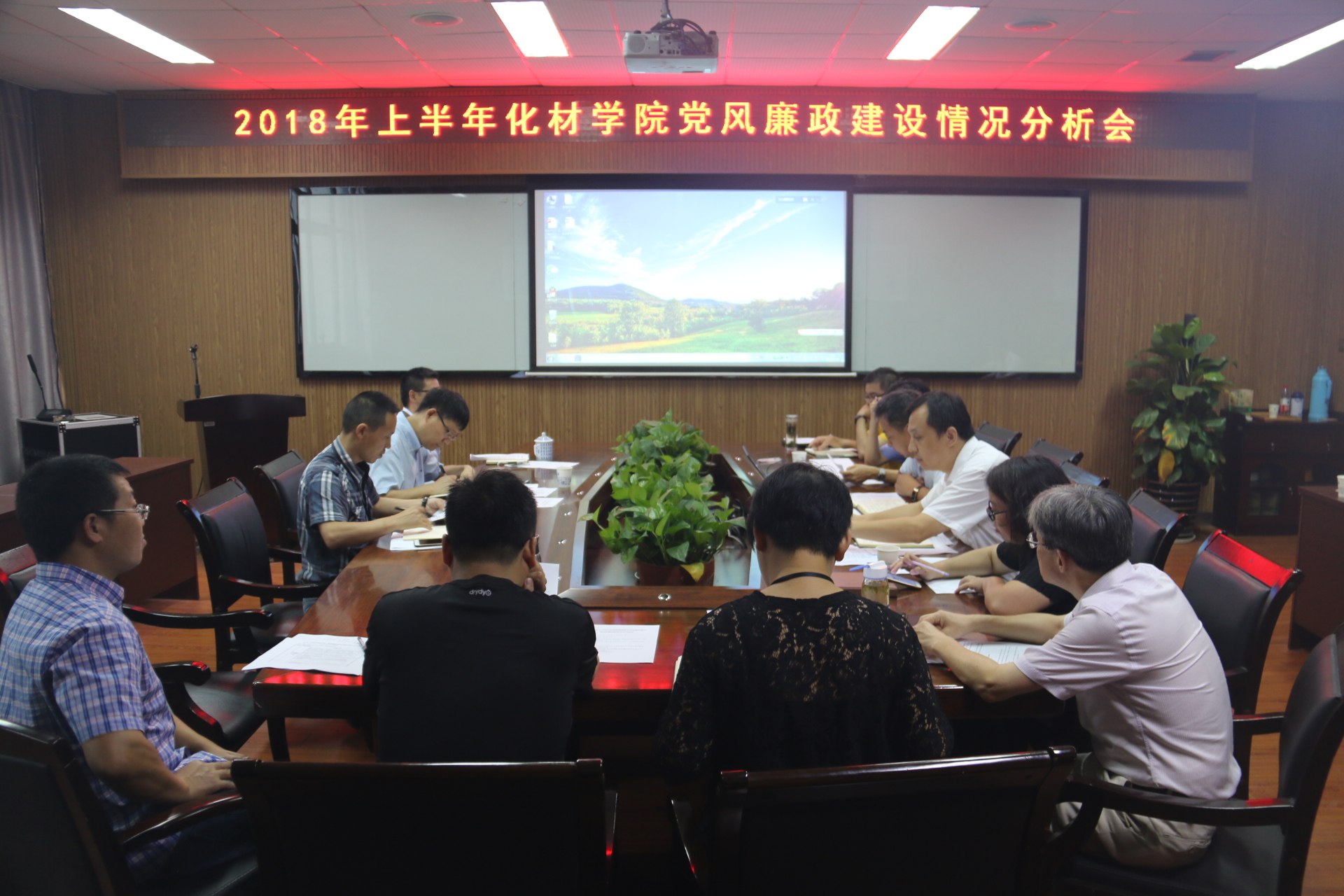 7月12日上午8:30,化材学院领导班子召开2018年上半年党风建设情况分析会和意识形态工作分析会。学院党委书记方乐平主持会议,学院领导班子成员、党委委员及各教工支部书记参加了会议,校党委校长办公室蔡联群主任莅会指导。