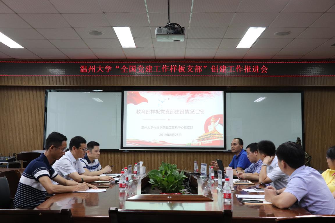 化材学院实验中心党支部获批全国党建工作样板支部培育创建单位。为进一步加强党建工作样板支部培育创建工作,推动新时代学校党建示范创建和质量创优,8月25日上午,学校在化材楼204会议室召开了全国党建工作样板党支部创建工作推进会。校党委委员、党委组织部部长郑信军,组织部副部长李祖祥等部门负责人出席会议,化材学院党委书记熊琳、副书记周敬业及样板党支部支委会成员、学院其他教工党支部书记参加会议。会议由熊琳主持。
