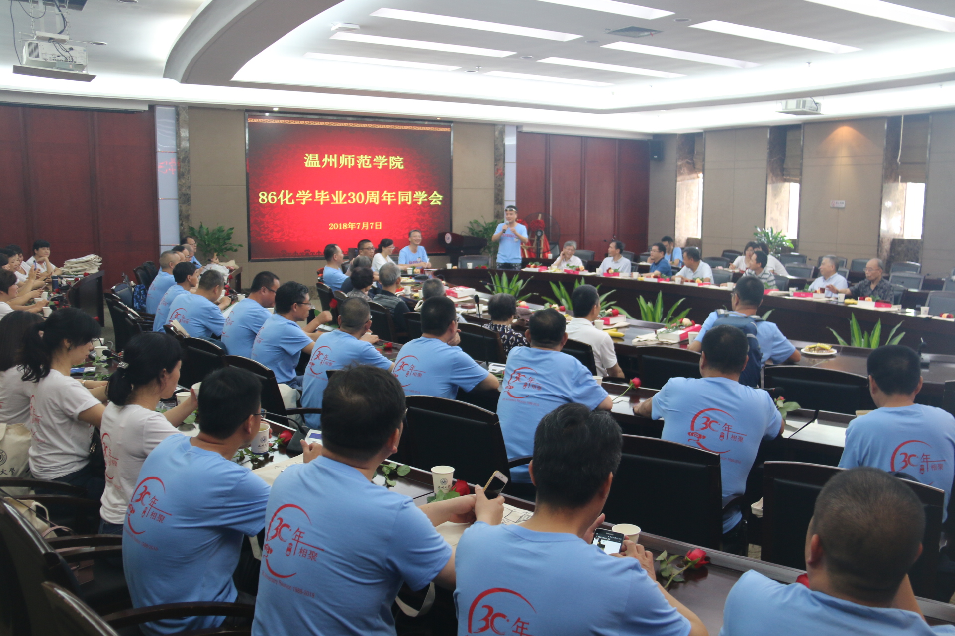 光阴荏苒,7月7日,温州师范学院86化学在南校区岩松堂白鹿厅举行毕业30周年同学会,共44位同学回到母校。化材学院院长王舜、书记方乐平、班主任吴华悦老师、退休老教师周锦成、张力学等十余位老师来到同学会现场,与校友们欢聚一堂,共叙师生情谊。