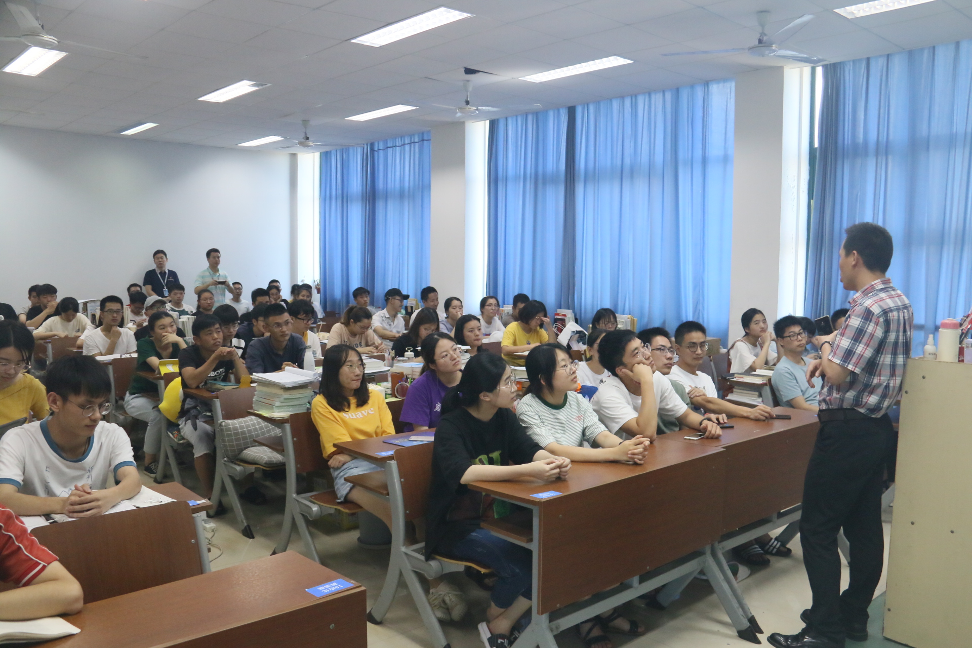 院长王舜、党委书记熊琳、党委副书记周敬业,学生科科长孙玮玮,辅导员邹涌彬、武晓岚一同前往11幢B座512教室看望并慰问暑期留校考研的学生。