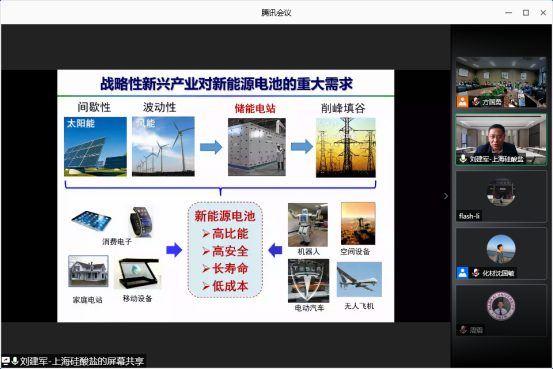 其次,中国科学院上海硅酸盐研究所刘建军研究员作了题为“计算电化学与高性能电极材料设计”的主题报告。该报告介绍了电化学储能材料的发展趋势,从有机柔性钠离子电池设计、无机阴阳离子电化学材料设计和电催化剂的筛选判断三方面讲解了电极材料的计算筛选与设计。