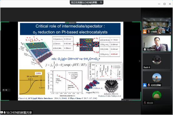 随后,武汉大学陈胜利教授作了题为“电催化中的“活性火山关系””的主题报告。该报告从中间体的覆盖度、如何合理地从多步骤反应中找到决速步骤和电催化pH的影响,讲述了对电解过程的研究。
