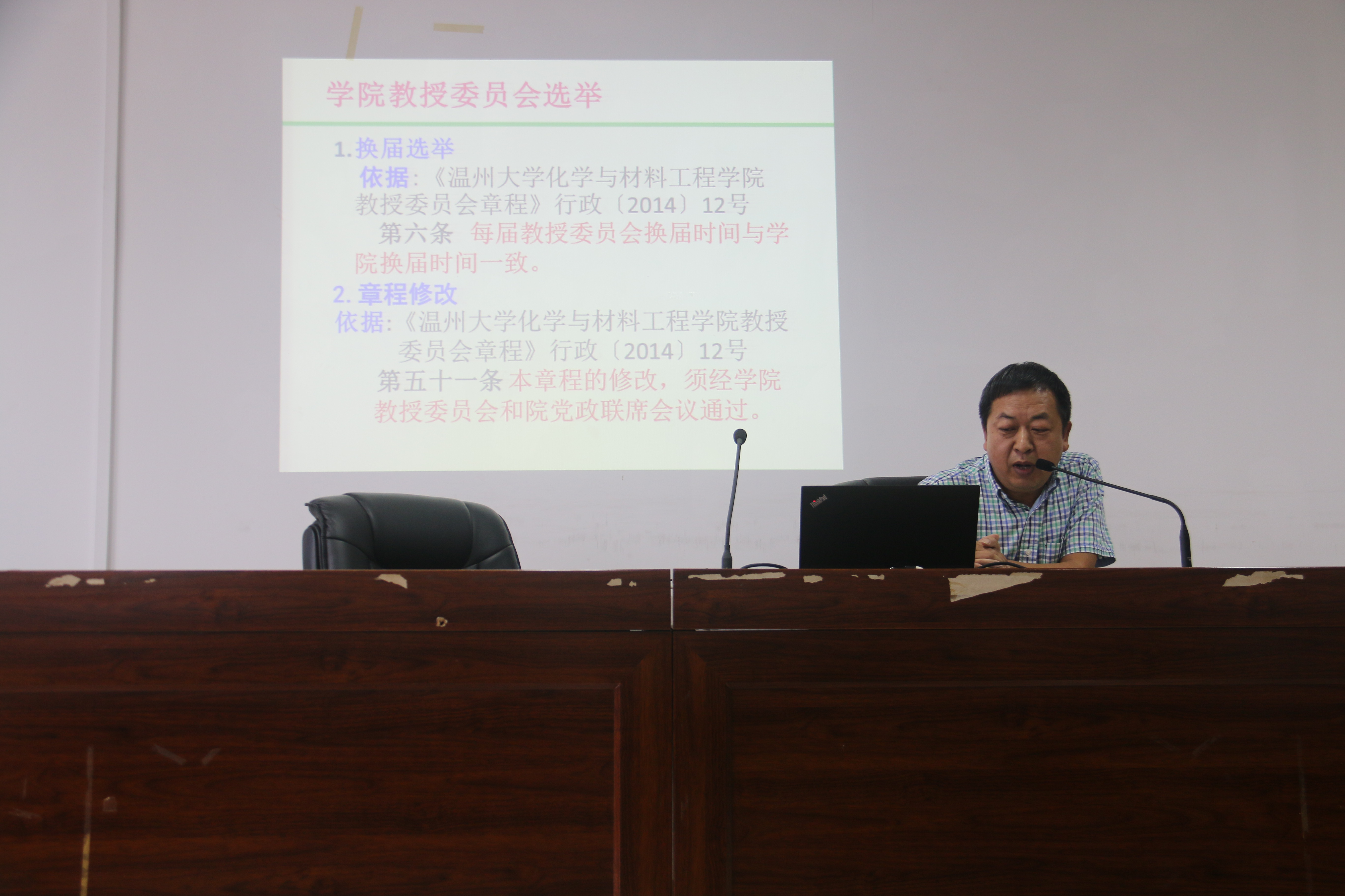 首先,党总支书记方乐平介绍了教授委员会章程、委员选举办法的产生过程,并对其主要内容进行了简要说明。在各系推荐、个人自荐和学院研究产生候选人的基础上,经全体教职工以无记名投票形式,填写选票并依次投票。经过严谨的计票、唱票环节,监票人宣布计票结果。产生了新一届教授委员会委员,马剑华、马德琨、王舜、兰云军、吴华悦、余卫芳、胡茂林(按姓氏笔划顺序排列)等7人当选。