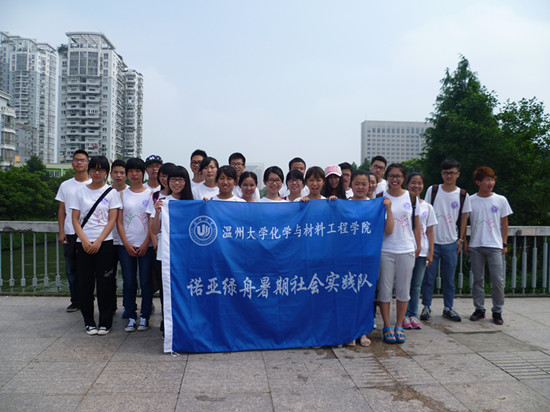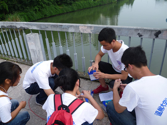 队员们分别选取了不同河段取水以保证最终结果的可靠性,为了防止水质贮存时间过长引起的误差,队员们充分运用专业知识,对一部分水试样进行了现场检测,初步粗略的测定其中所含组分的含量范围,同时,一部分水样带回进行精测,准确分析水试样当中各组分的浓度含量。之后,诺亚绿舟队员们同浙江理工大学建筑学院暑期社会实践瓯江小分队成员进行了关于“五水共治”问题的交流,大家自由全面的讨论,了解到他们实践队的工作方向:大学生现阶段主要的工作就是宣传和监督,浙江理工大学的同学通过让小朋友们自主作画心目中的家乡让大家明白保护环境治水的重要性,治水需要全民行动,从我做起;同时,他们还举办展览以警醒大家的治水意识。经过大家的交流对于一些尚不完善的方案和想法两个实践队共同前往环保局和有关负责人进行了沟通,通过环保局工作人员介绍,经实行“河长制”以来,实现了从市到县到镇再到村的一体监督治理,并且,经过同公安环保执法合力打击违法企业及媒体的大力宣传倡导治水,今年已取得了很大成效,其中5.6万人次,1.9万企业家共同参与了投资治水。