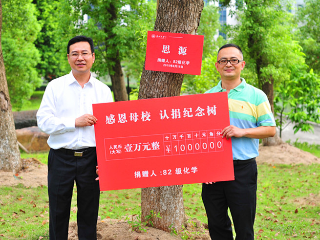 15日下午的座谈会上,王舜院长向校友介绍了化材学院的发展情况,感谢校友们对学院的持续关注和支持。在同学们简短的自我介绍后,陈迈、陈仁尔班长代表全体同学表达了对老师和学校的感恩之情,对同窗的深切友情。林娟娟副书记回顾了当年担任班主任的情景,真诚邀请校友常回母校看看,始终如一地关心母校和母院发展。为感恩母校,82化学校友向母校捐赠10000元,在校友林认捐“思源树”,寄托学子对母校的深情厚谊和感恩之情。为感恩化材学院培养,校友们向学院赠送一幅名为“桃李满园”的花卉国画,并向“化材之光”基金会捐款10000元,以表达对母校发展壮大、学子茁壮成长的殷切期望。
