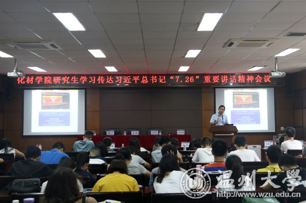 9月23日上午,在化材学院11B208会议室,潘从义副书记为同学们作形势政策讲座。正式开始讲课前,潘副书记向大家介绍了学院的研究生会组织和学院开展的校园科技文化活动,鼓励大家积极参加,充分利用校、院搭建的各类平台提升综合素质,全面发展,为将来奠定坚实的基础。讲座开始后,潘副书记从国内国际政治形势谈起,重点为大家解读了习近平总书记“7.26”重要讲话精神,从 “我们党要举什么旗、走什么路”、“以什么样的精神状态”、 “担负什么样的历史使命、“实现什么样的奋斗目标”四个方面为同学们具体的阐明了7·26讲话的主要内容,并提出作为新一代的有为青年,我们要积极响应习近平总书记号召,为决胜全面小康社会实现中国梦而努力奋斗。