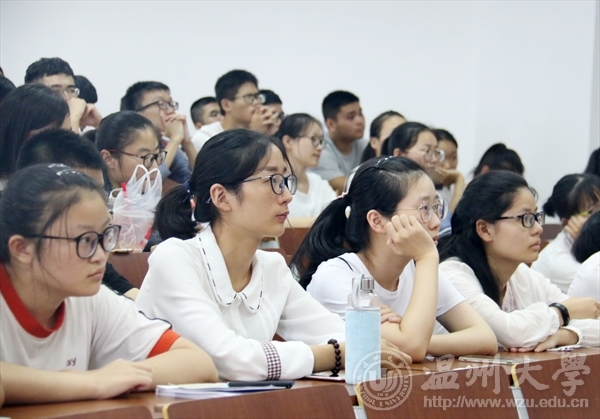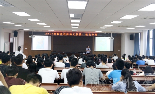 张力学老师、图书馆何清老师以及2017级全体本科生。大会由易招娣老师主持。