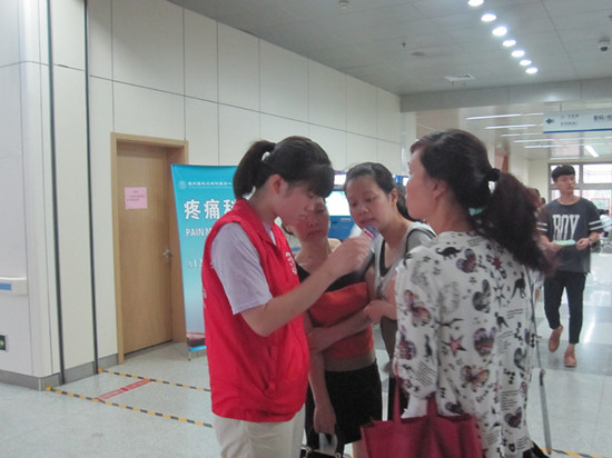 “微笑天使”暑期社会实践队第四天在温州医科大学附属第一医院进行了以志愿者形式展开的实践活动,期间全体20名成员身着红色志愿者马甲热情地为熙熙攘攘的人群服务。