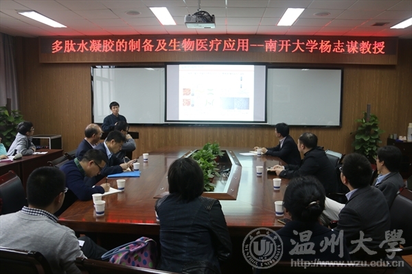 作了题为《多肽水凝胶的制备及生物医疗应用》的学术报告。校长李校堃、化材学院书记方乐平、副院长杨小平、副院长陈久喜、相关师生50余人参加了此次学术报告。