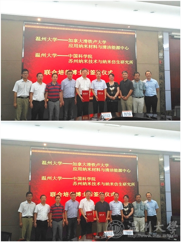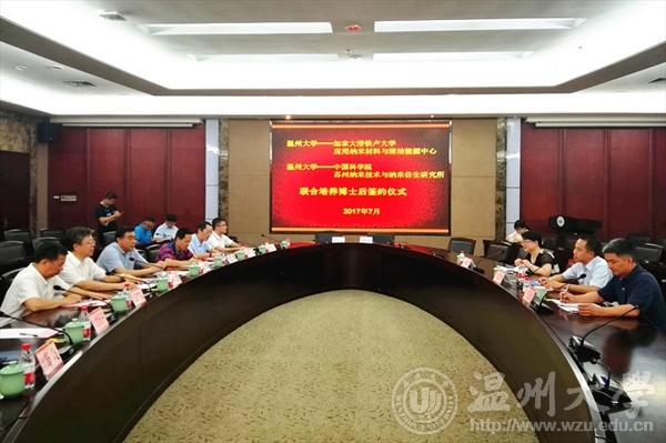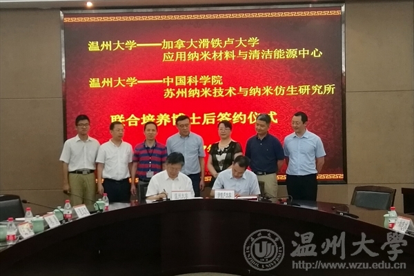 与加拿大滑铁卢大学应用纳米材料与清洁能源中心、中国科学院苏州纳米技术与纳米仿生研究所举行联合培养博士后签约仪式。加拿大滑铁卢大学陈忠伟院士、苏州纳米研究所王强斌研究员、温州市外国专家局局长林晓冰、校长李校堃、副校长薛伟以及人事处、外事处、研究生部、化材学院相关负责人出席仪式,签约仪式由副校长薛伟主持。