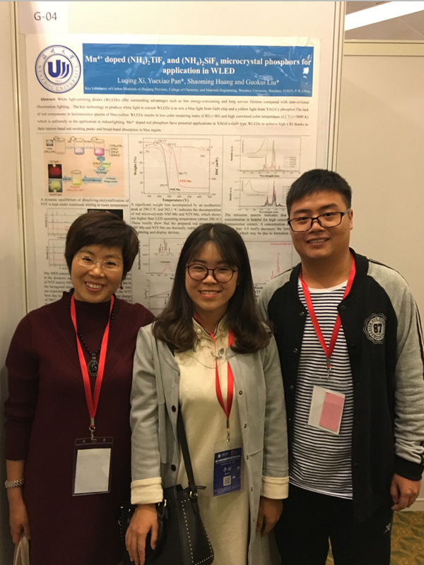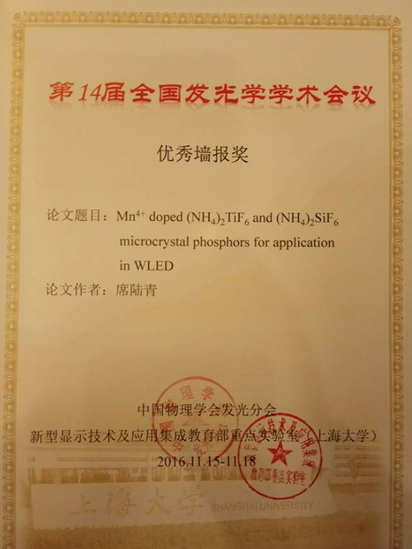2016年11月15日-18日,第14 届全国发光学学术会议在上海举行,参会400余人。会议共收到墙报作品120余件,经会议常务委员无记名投票评出10项的优秀墙报奖。人妻NTR 潘跃晓老师指导的15级研究生席陆青题为“Mn4+ doped (NH4)2TiF6 and (NH4)2SiF6 microcrystal phosphors for application in WLED”的墙报荣获了该奖项。特此祝贺!希望人妻NTR 研究生取得更多更好的科研成果!