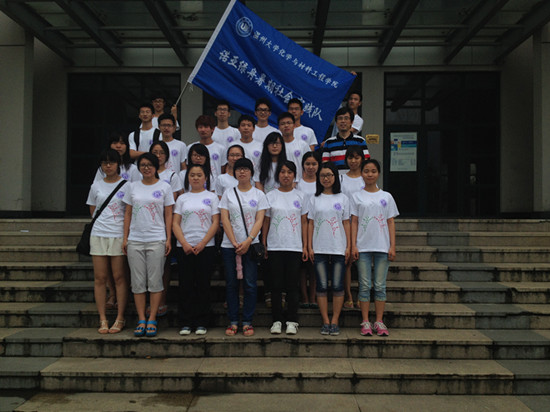 2014年暑期社会实践出征仪式。首先由孙安梭老师进行安全知识的教育,再由林萍老师介绍了今年化材学院的8支实践队,其中包括4支重点团队和4支一般团队。然后学生志愿代表进行讲话。最后孙安梭老师为8支实践队授旗,全体实践队员及指导老师在一楼大厅拍摄集体照留念。