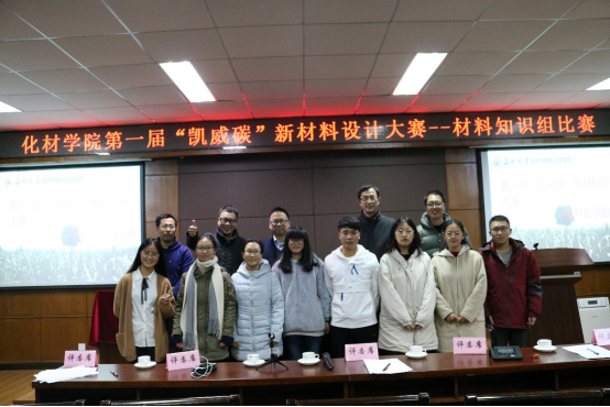 化材学院第一届“凯威碳”新材料设计大赛材料知识组比赛在化材楼11B208会议室举办。材料系主任杨植老师,材料系副主任杨昕宇老师和尹德武老师,以及材料系樊宏斌老师、刘若望老师,作为评委出席本次比赛。材料系主任杨植老师为比赛致辞。
