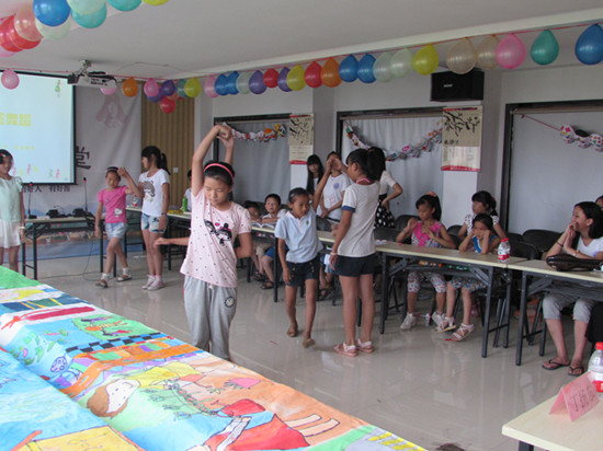教授王稼国老师讲话,王老师提到,相比实践前,队员们都有了很明显的进步;最后是队长胡君美发言。在胡君美简短的发言后,文艺汇演正式开始。此次表演的主角是丽岙三小的孩子们。孩子们准备了很多节目,有舞蹈,独唱,歌曲串烧等等,形式丰富,中间还穿插三个队员们的单独表演。最后演出以孩子们一支华尔兹顺利落幕。