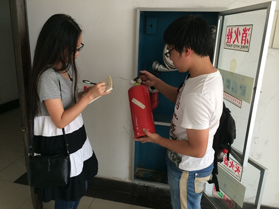 为了更好的完成任务,队员们先到娄桥消防分队进行短暂的消防知识大补习,由于这关系到下午的检查,每位队员都听得很认真。补习结束后,张队长说消防安全关系到人的生命,希望队员们能认真对待,一个小细节可能也会导致一条生命的消失,队员们顿时感到责任重大。回到学校后,队员们在化材学院门口集合,开始分组分工进行检查。队员们三人一组,每组检查一层。队员们的主要任务是检查消火栓、水泵、灭火器以及应急灯是否完好。水泵要去用手转一下,看是否因为生锈而转不开。灭火器主要检查其压力情况,指针指向绿色代表正常,若指向黄色代表压力过低,需要更换。化材学院虽然不时很大,但是每一层的消防设施却不少,足以看出学院对消防安全的重视情况。下午5点,检查工作顺利结束。