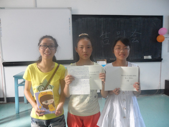 今天是实践的最后一天,起的比以往都要早,一大早就开始收拾自己的行李。随后到了上课时间,第一个环节是学生们的合唱《雪绒花》,这首歌是上课的时候队员们教给他们的,虽然过了这么多天,但是他们还是记得,着实令人感动。然后便是队员们的节目了,队员们以两两组合的形势,给学生们送上了一首首好听的歌曲。有吴东林和陈洁的《新贵妃醉酒》,李林和孔雅洁的《你是我心内的一首歌》,胡帅邟和蔡韩琦的《黄鹂鸟》,苏颖和方也的《时间煮雨》,周慧和俞其忻的《梁山伯与朱丽叶》,魏沈洁和陈细鹏的《小苹果》,还有小朋友们的节目也很棒,小朋友和队员们都很开心。在表演完队员们的节目之后,开始了颁发奖品的环节,我们根据学生的出勤情况,给他们他们发了一本本子和一直铅笔,然后从平时课堂中抽选了八位有优秀作品的学生,还评选了“最受欢迎的哥哥姐姐和老师”共四名并颁发了奖品。最后在胡帅邟的游戏中结束了一早上的欢送会。