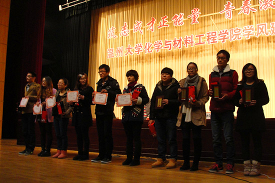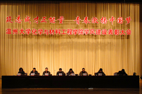 “筑志成才正能量·青春激扬中国梦”学风建设表彰大会于大学生活动中心育英大礼堂隆重举行。化材学院院长黄少铭、党总支书记程亚倩、副院长王舜、叶明德、党总支副书记孙安梭、教学科科长孙安娜、办公室主任洪映君以及学生科科长王壮出席了此次大会。全体老师、全院研究生、本科生参加了此次大会。