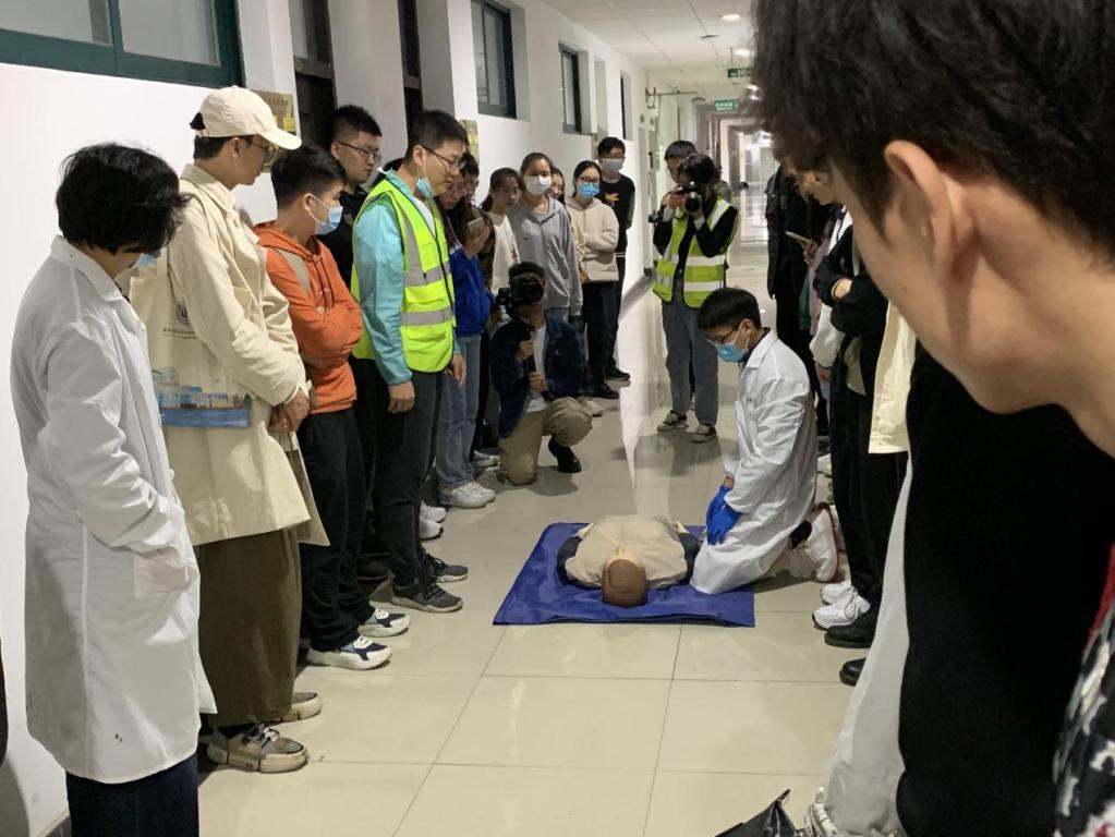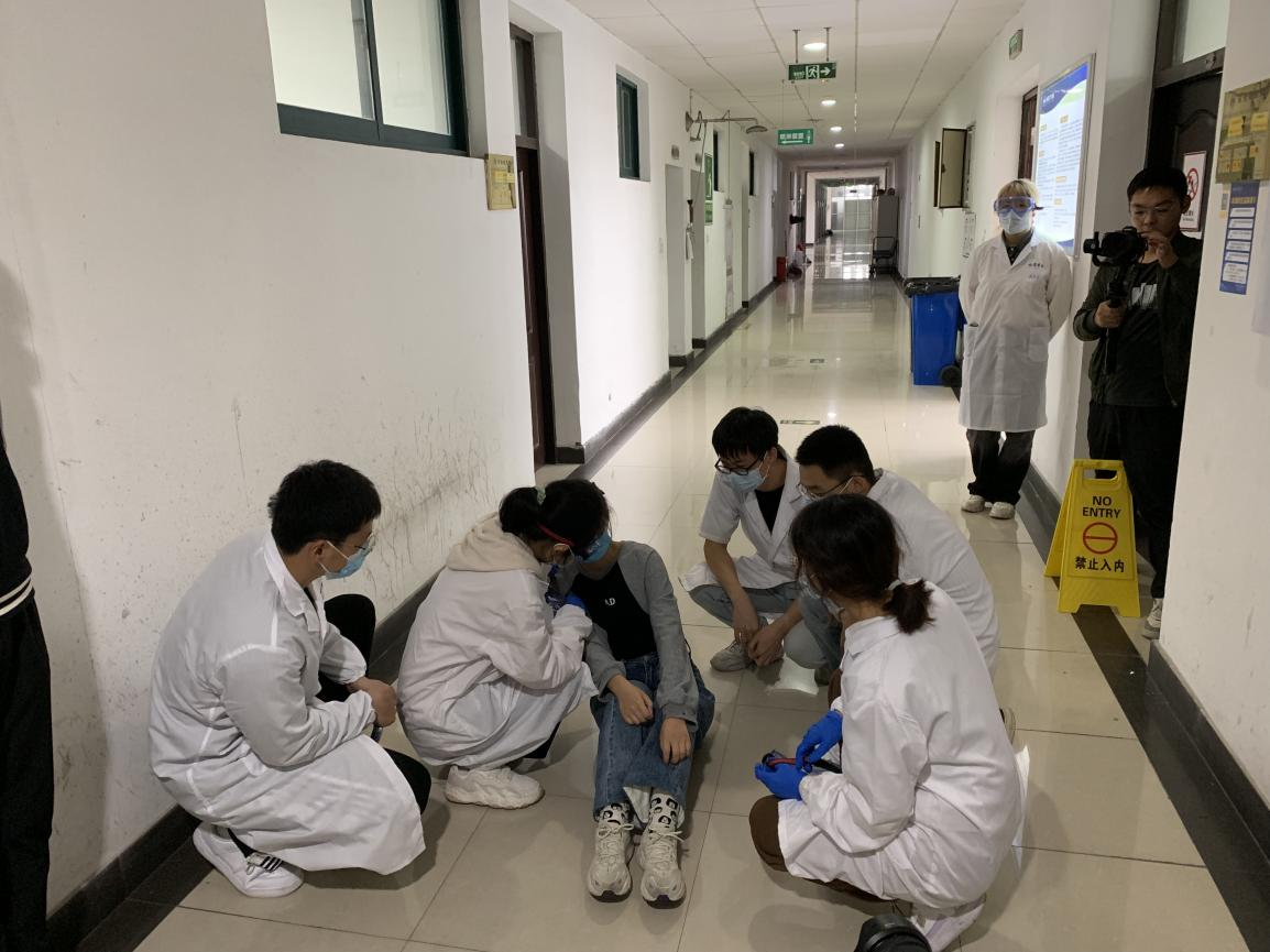 本次演习以危险化学品丙酮泄漏为主线展开,现场模拟了实验人员在使用丙酮试剂时,试剂意外泄露并沾染了皮肤情境下应如何做好应急处理。另外,现场还向同学们演示当有人员中毒,如何做好现场疏导、心肺复苏等工作。