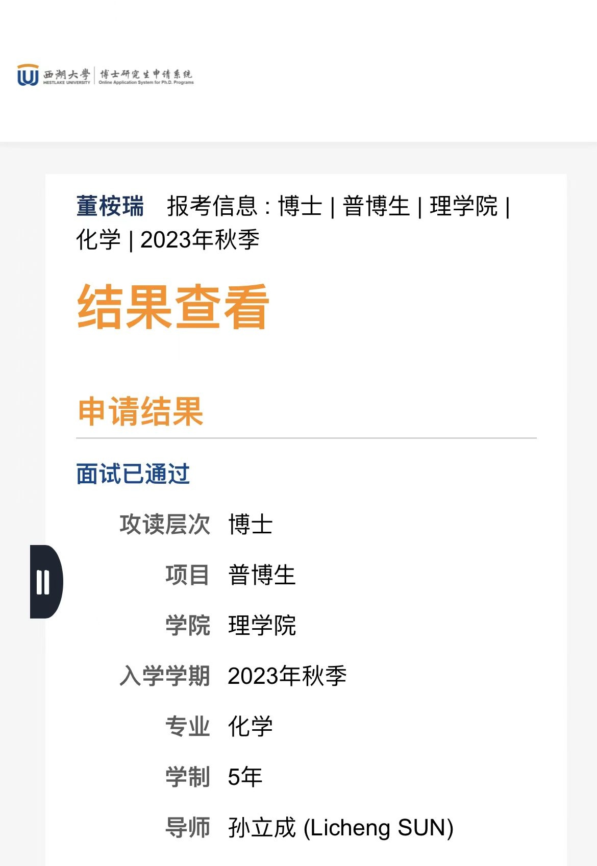 人妻NTR 2018级应用化学专业学生董桉瑞获西湖大学直博生资格!据悉,此次西湖大学直博生招生共1000余人报名(含研究生),58人进入面试阶段,最终董桉瑞同学凭借个人优异成绩突出重围获得直博生资格!