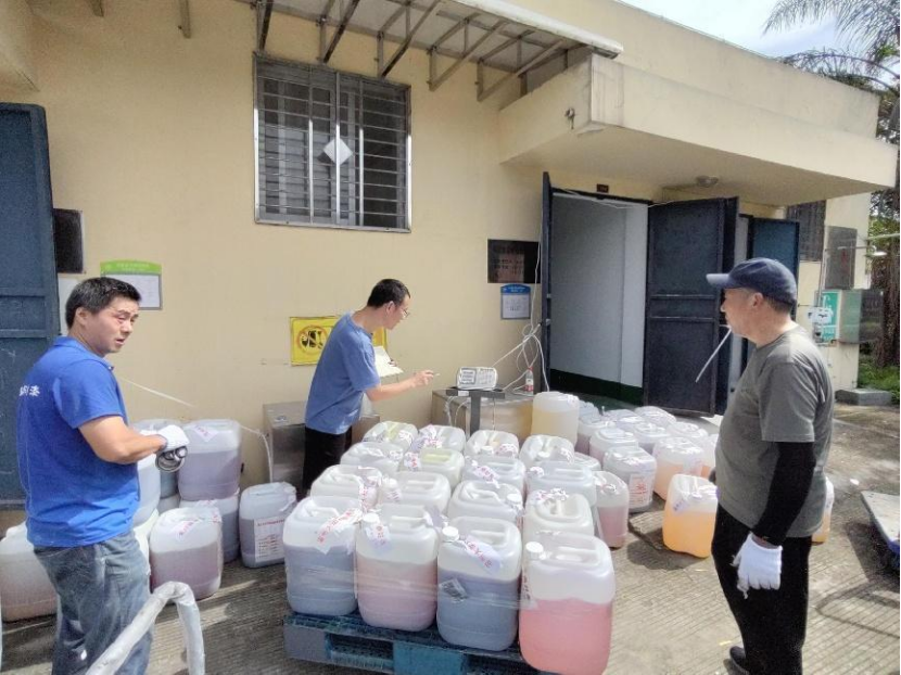 2023年6月30日早上8:30,处置公司人员进行废液测试,以有效保障废液转运过程的安全。经过磅、装运、交付危废转运联单后,于中午10:45顺利离校。此次实验室废弃物共转移处置有机废液、无机废液等及少量废弃试剂(76.2公斤)共计6.851吨,其中化材学院5.919吨,生环学院0.932吨。