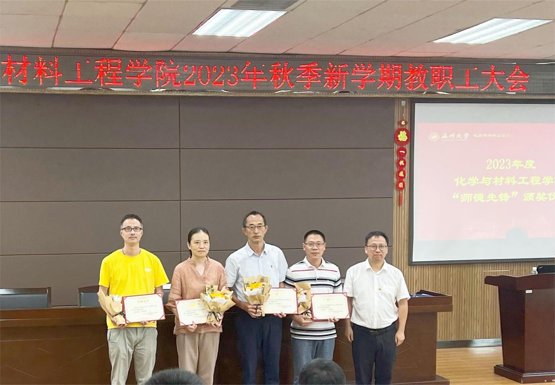 会上,还举行了2023年度学院“师德先锋”颁奖仪式,由学院院长杨植为陈迪妹、樊宏斌、胡建波、邵黎雄4位老师颁发荣誉证书和鲜花。
