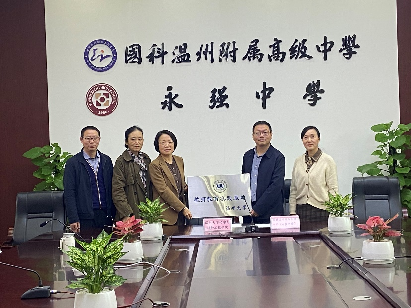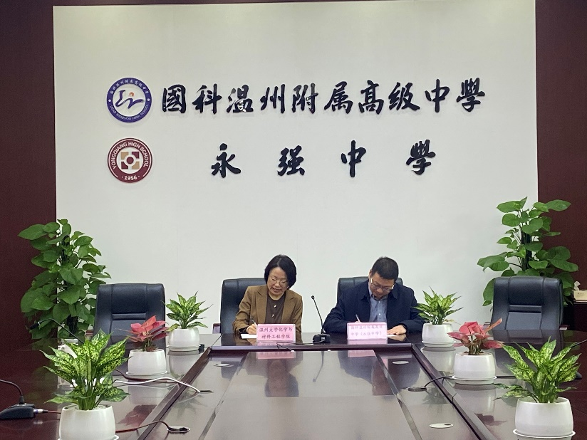 与温州市龙湾区国科附属高级中学(永强中学)共建教育实践基地的签约仪式在永强中学行政楼活动室举行。化材学院党委书记刘吟、化学系主任方国勇老师、陈迪妹教授,永强中学副校长李勇、教研处主任谢炳杰以及化学教研组长李桂双老师出席签约仪式。