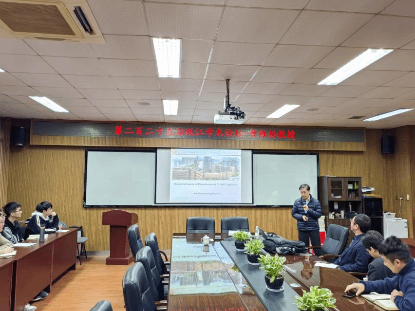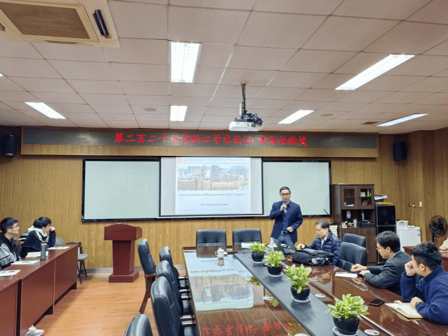 ,在11B-204作了题为“Recent Advances in Phosphorescent Metal Complexes”的讲座。报告由化材学院钱鹏程教授主持,首先,化材学院钱鹏程教授对黄维扬教授的到来表示热烈欢迎,并向师生介绍了黄维扬教授的基本情况。