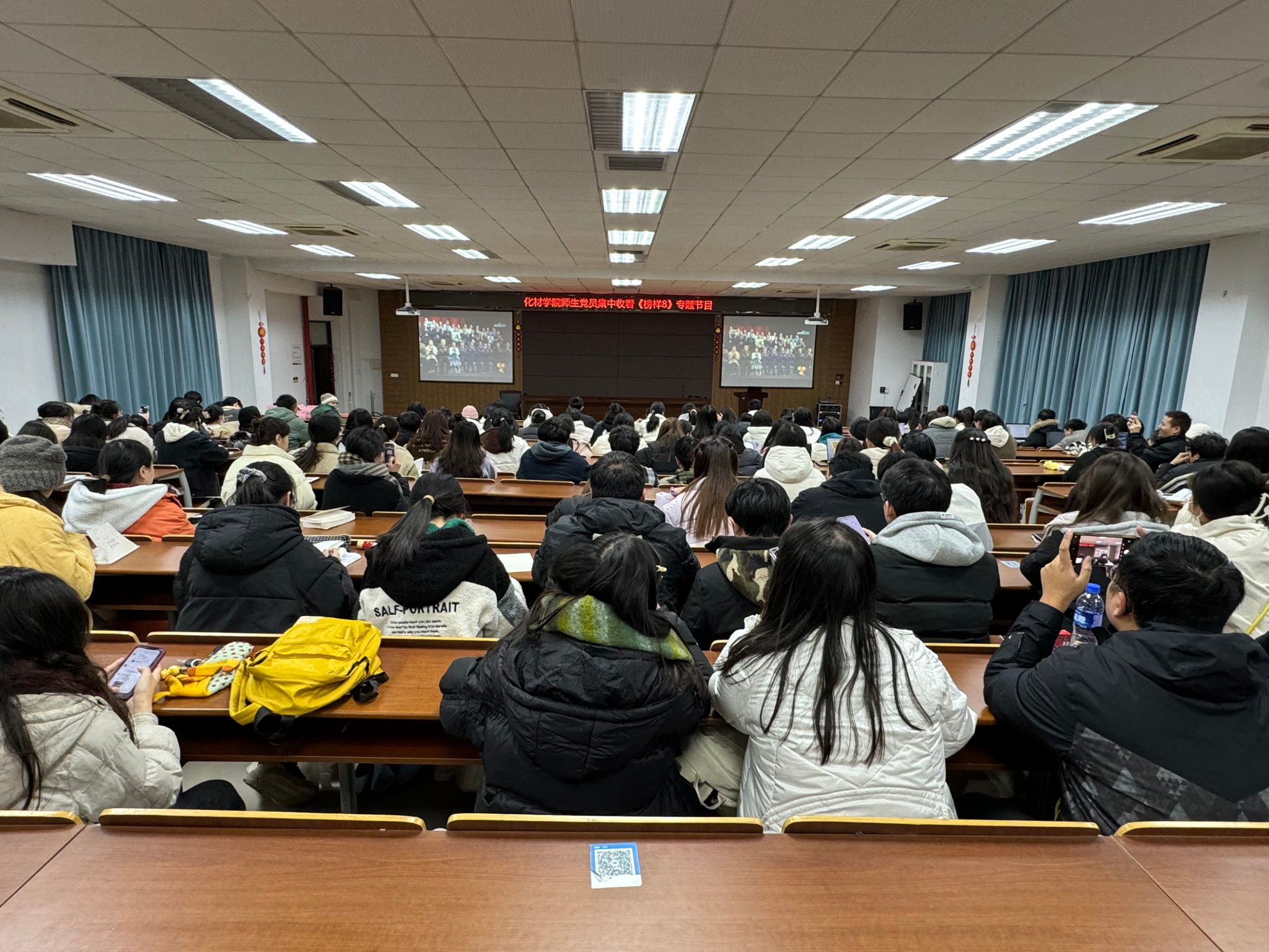 为深入学习贯彻习近平新时代中国特色社会主义思想,持续推动主题教育走深走实,教育引导广大党员学习榜样、争当先进,在榜样的引领下坚定理想信念,在精神的感召中汲取前行力量,12月21日晚,化材学院组织师生党员在11C401集中收看《榜样8》专题节目,未到现场观看的党员同志自行观看。