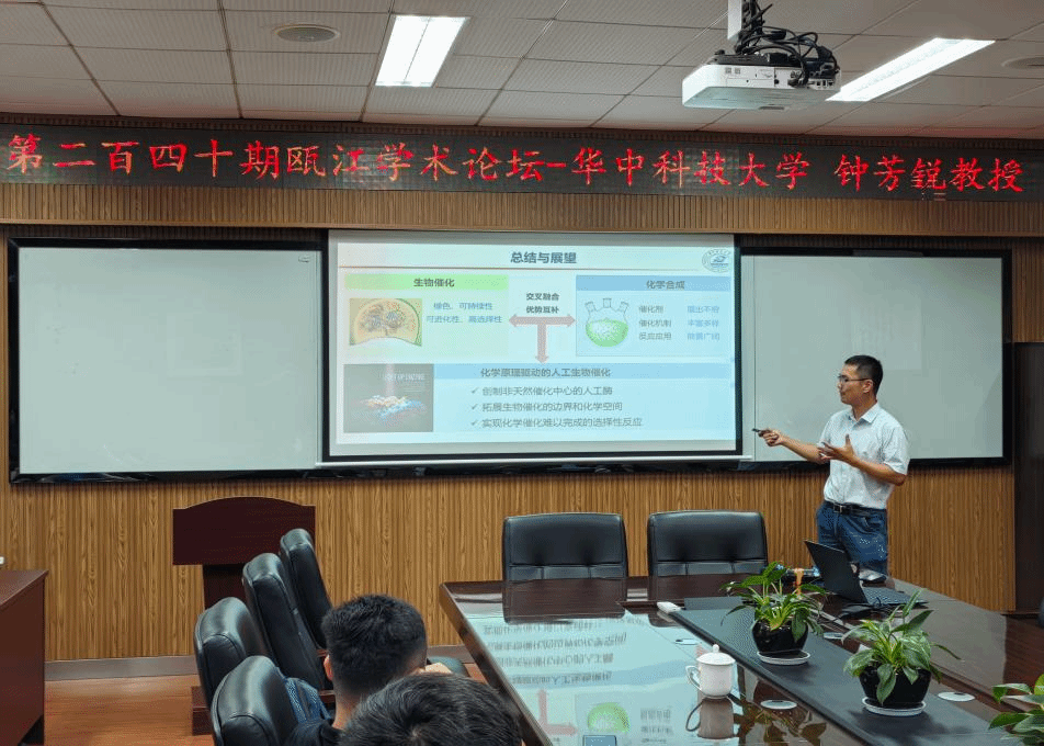 化材学院第二百四十期瓯江学术论坛,在化材学院204会议室为师生们做题为“化学原理驱动的人工光酶不对称催化”学术讲座。讲座由化材学院李龙教授主持。