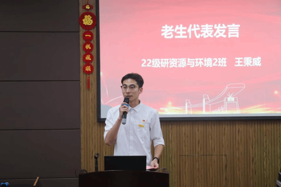 老生代表22资源与环境班王秉威同学发言。他分享从参与研究生创新基金到发表SCI一区论文的经历,和学弟学妹们共勉,要始终坚持“求学问是、敢为人先”的精神,做有价值科研、锻炼综合能力、勇担强国使命,为未来而学,与时代共振,努力成长为未来化学产业行业的拔尖人才。