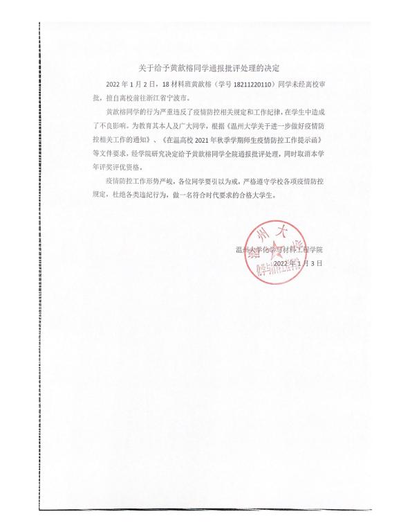 关于给予黄歆榕同学通报批评处理的决定