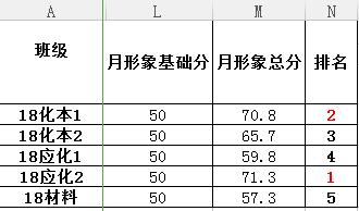 每月最后一周由学生会学风建设中心对本月各项考核指标进行统计核实后,将本月月形象班级评比得分进行公示: