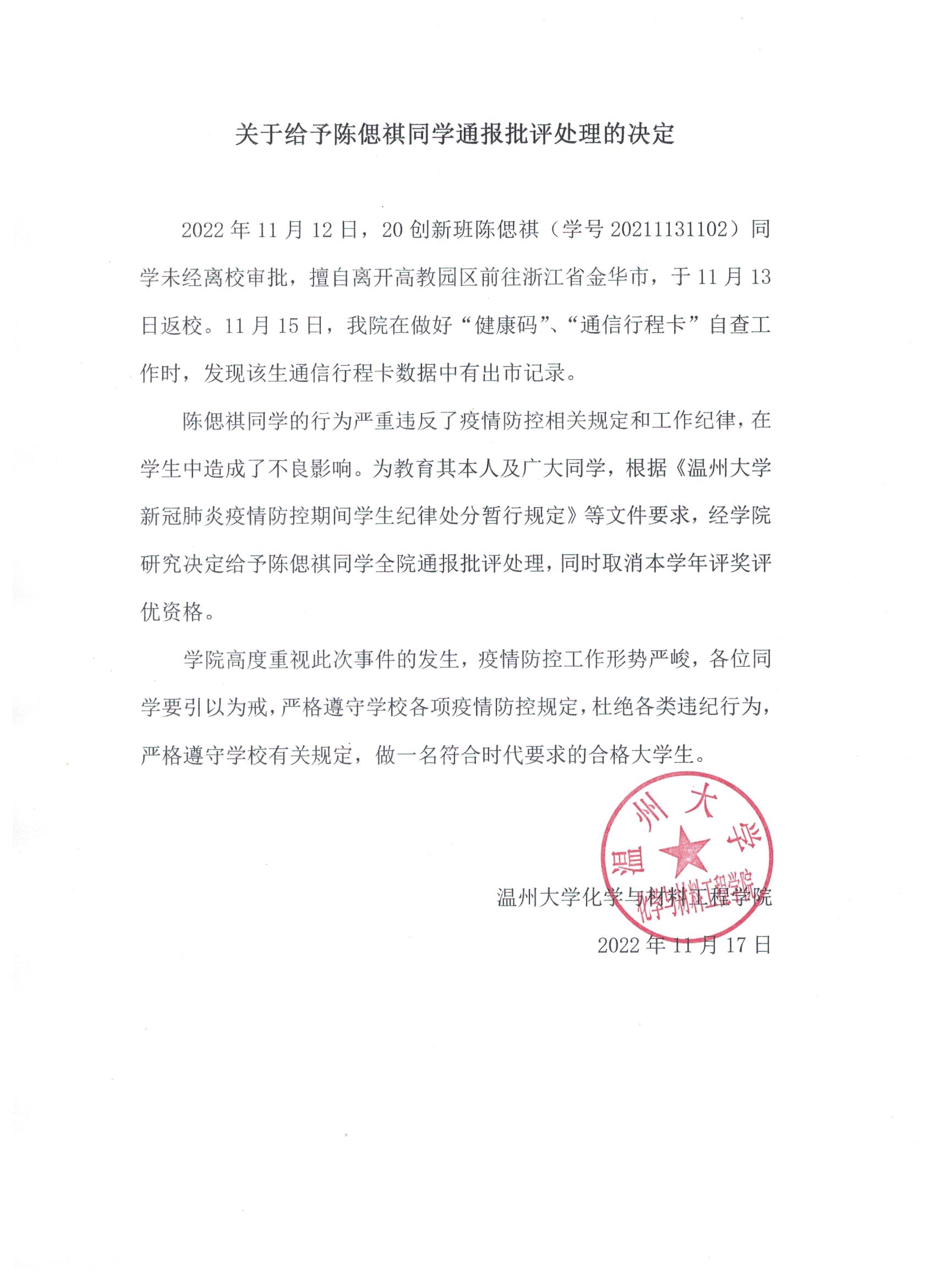 关于给予陈偲祺同学通报批评处理的决定