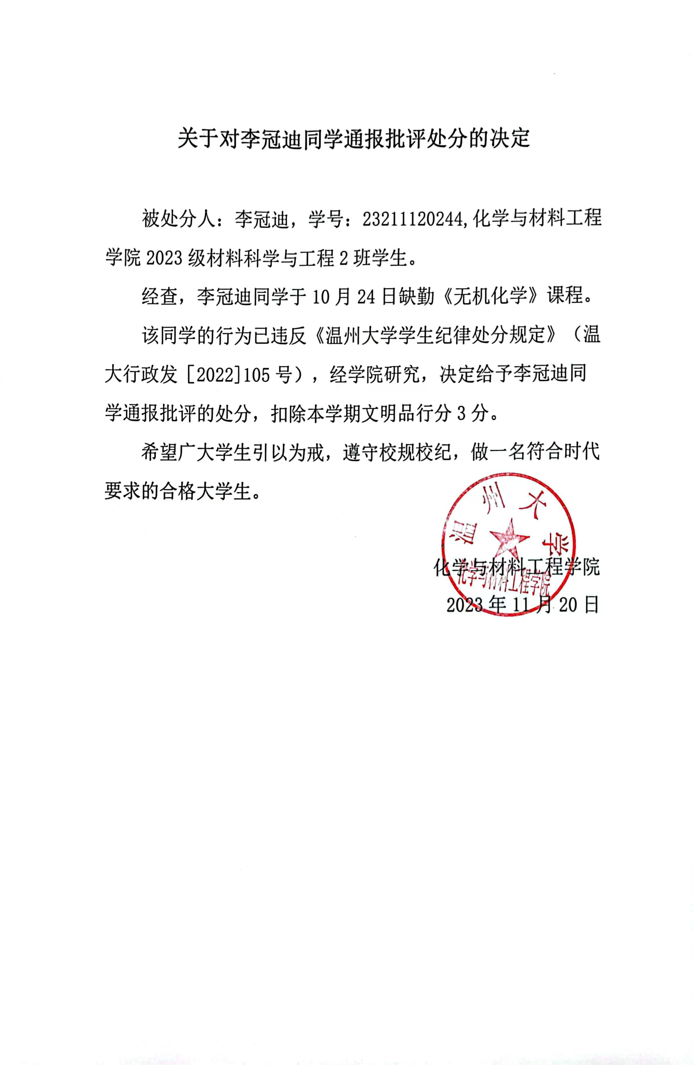 关于对李冠迪同学通报批评的决定