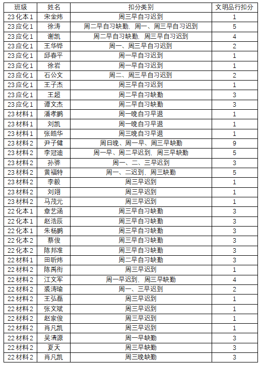 化学与材料工程学院”微信公众号平台公布本周考勤结果,如对公布的考勤结果有异议请当周周五下午4:30前到学生科办公室11B223说明情况,过时无效。22级、23级联系邹培杰老师。3、每周将在化材学院官方网站上公布上周最终考勤结果。4、早晚自习考勤结果纳入月形象班级考核。