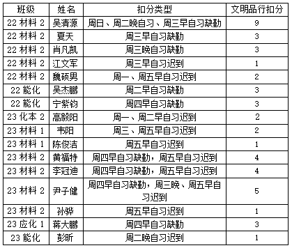 ”微信公众号平台公布本周考勤结果,如对公布的考勤结果有异议请当周周五下午4:30前到学生科办公室11B223说明情况,过时无效。22级、23级联系邹培杰老师。3、每周将在化材学院官方网站上公布上周最终考勤结果。4、早晚自习考勤结果纳入月形象班级考核。