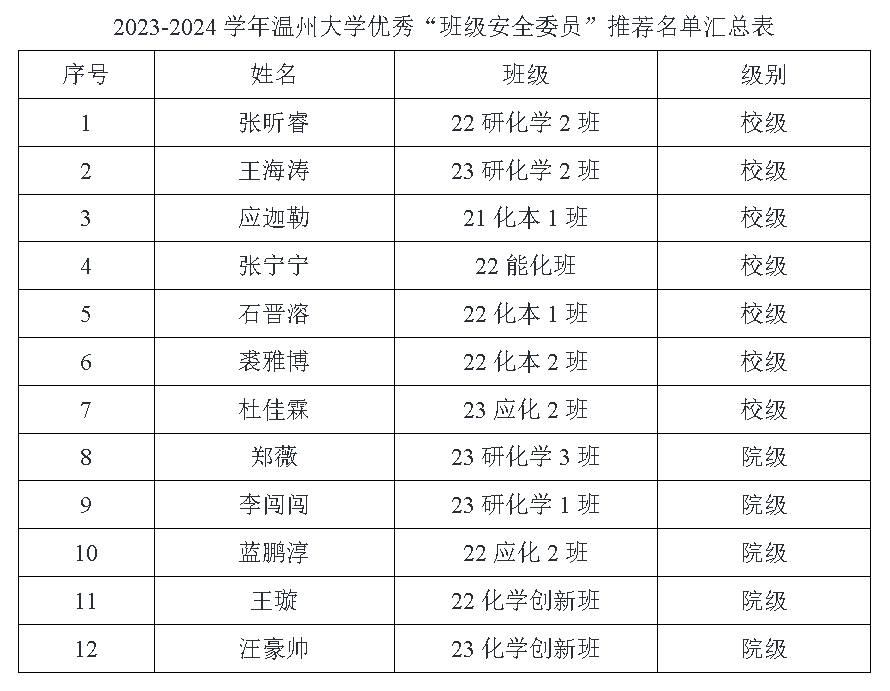 2023-2024学年优秀“班级安全委员”评比活动的通知》工作要求,经班级安全委员个人申请、学院评选,推荐张昕睿等12位学生为2023-2024学年优秀“班级安全委员”拟获得者。现将名单予以公示,请各班级以及个人认真核对,如有异议请于公示期内与学工办联系。