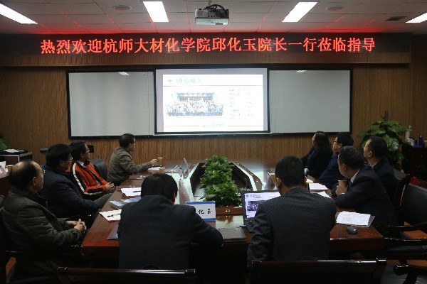 2015年12月8日,杭师大材化学院邱化玉院长、李兴听书记等一行莅临我院,围绕化学学科和专业建设方面进行调研。院长王舜、党总支书记方乐平、党总支副书记潘从义以及学院其他相关教师参加。