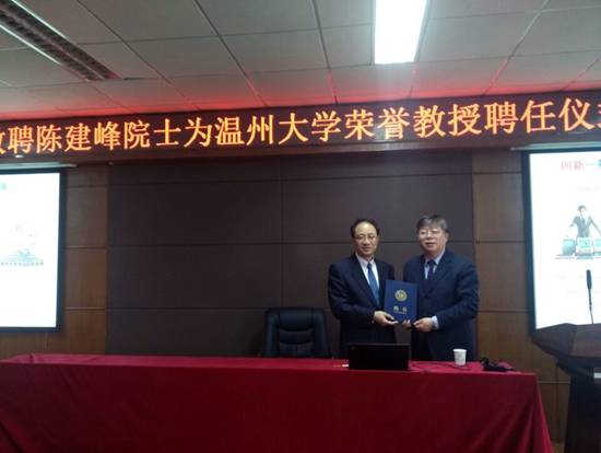 报告结束后,举行了聘请陈建峰院士为温州大学荣誉教授、化材学院学科发展学术委员会首席专家仪式,校长李校堃为陈建峰院士颁发聘书。