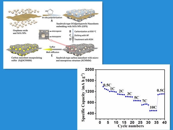 最近,化学学科黄少铭教授团队,在杨植博士具体指导下,通过运用一种简单的刮涂技术,设计和开发出了基于石墨烯/二氧化钛的超轻插层膜,将该膜应用在锂硫电池正极和隔膜之间后,能很好地发挥二氧化钛选择性化学吸附硫这一特性,有效抑制多硫离子的“穿梭效应”。使用该技术后所组装的锂硫电池在2C和3C的放电电流下循环1000次后,分别展现了仅0.01%和0.018%的每圈容量衰减率,展现了良好的潜在应用前景。相关研究结果发表在国际顶级学术刊物 Adv. Mater.上 (2015,27,2890) (影响因子15.4) (图1)。同时课题组的陈锡安博士通过模板法合成兼具高比表面积和大孔容的三明治型石墨烯基分级多孔杂化碳纳米片,并以此为载体夹心封装硫获得了高性能的锂硫正极材料(S@SCNMM) (图2a)。该材料充分发挥了杂化碳结构中的夹心层石墨烯、10-25nm厚度的碳纳米片以及丰富的微介孔的协同效应,有效地增加了硫担载量,抑制了多硫化锂的溶解,并改善了硫正极材料的导电性、进而极大地提升了锂硫二次电池容量、循环稳定性以及倍率性能(图2b)。相关结果发表在另一国际一流学术刊物Adv. Energy Mater. 上 (2014,4,1301988 ) (影响因子14.4)。